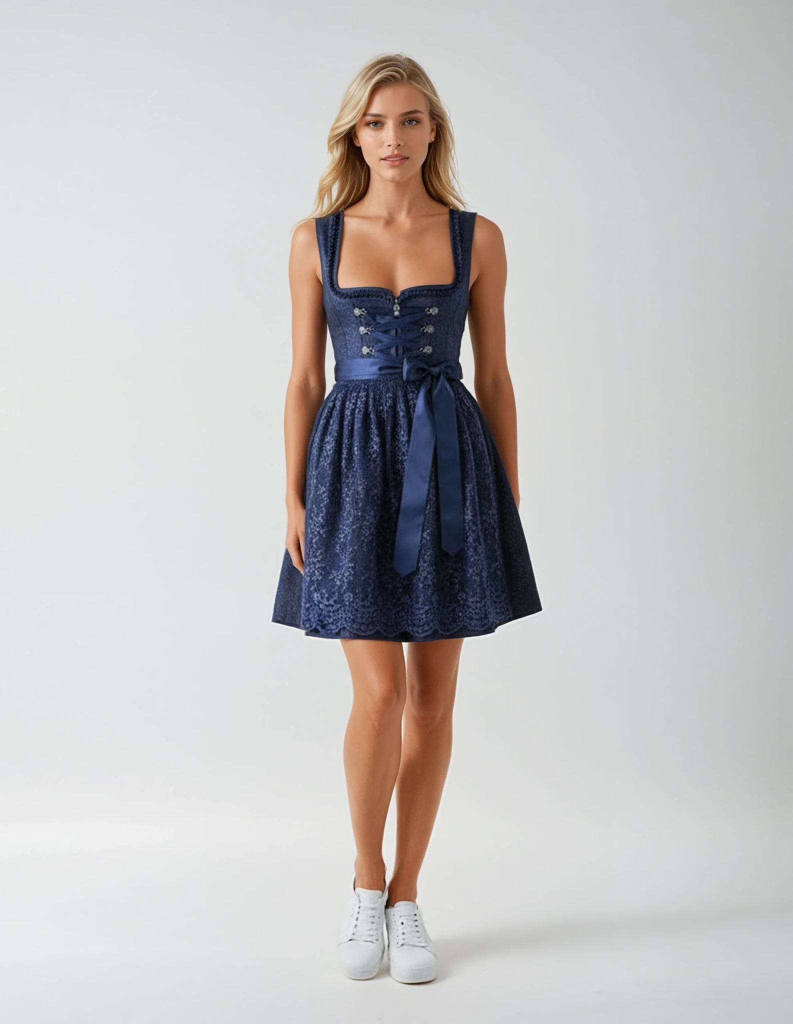 Wunderschönes kräftig blaues Dirndl in Rocklänge 60cm, in dem jede Trägerin den perfekten Auftritt hinlegt. Die zart bestickte Schürze und das dunkelblaue Schürzenband harmonieren perfekt mit dem in sich gemusterten Oberteil